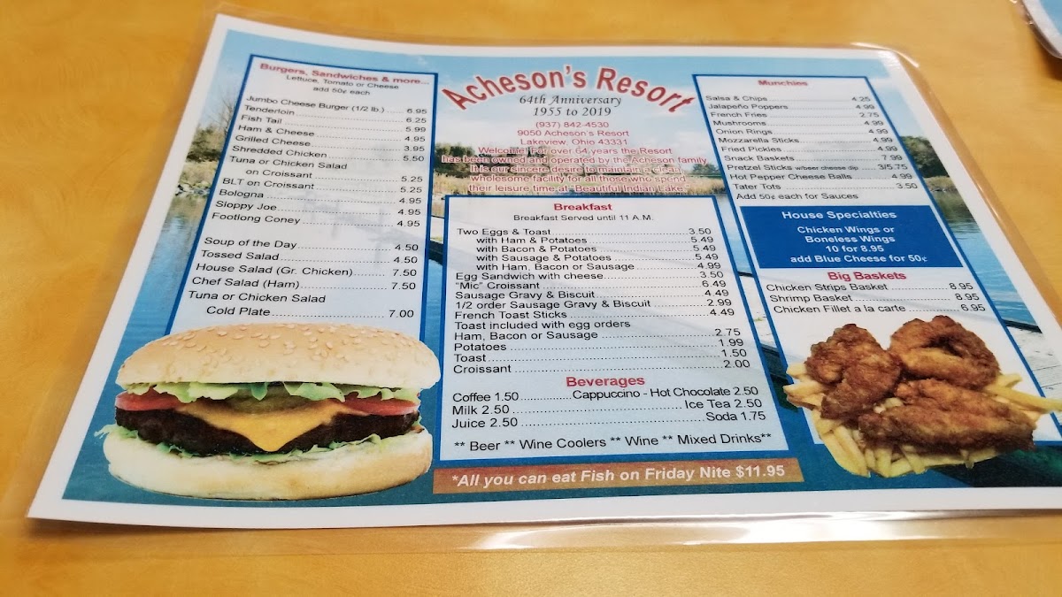 Welcome to Acheson's Resort, a charming lakeside dining destination located at 9050 Acheson Resort St, Lakeview, OH. This vibrant establishment offers an exciting menu that captures the essence of comfort food.